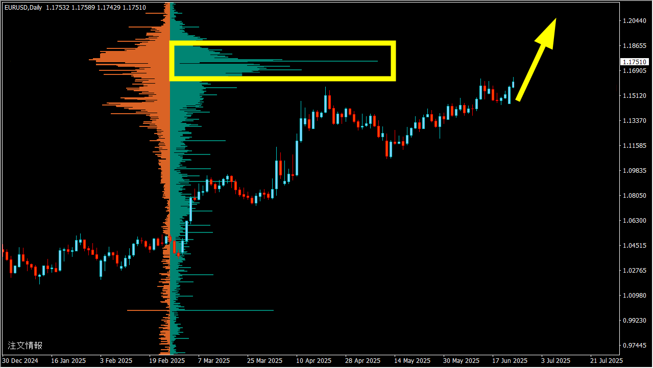 不均衡(インバランス): 左右のどちらかに大きくグラフが突き出しているポイントは、市場参加者の意識が集中している価格帯です。