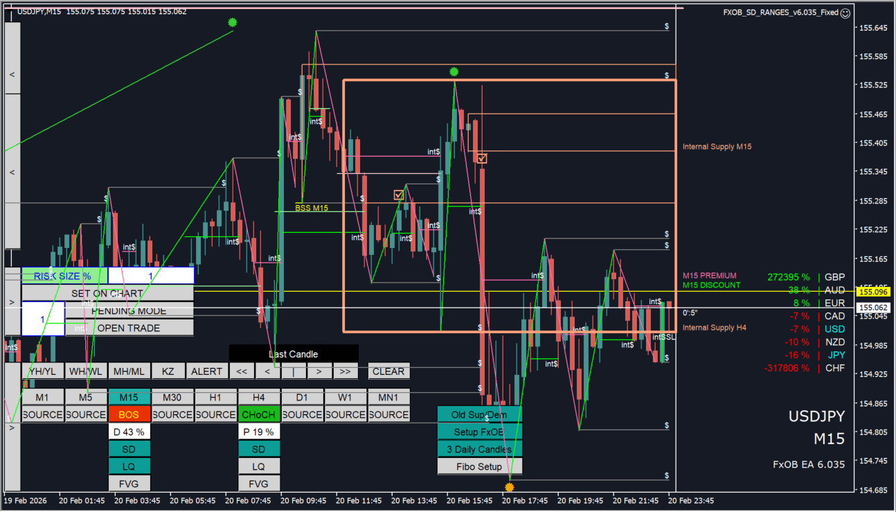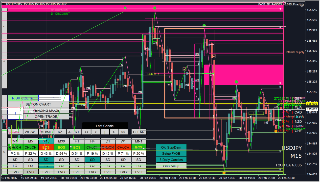 各セッションの高安値、POI、流動性ゾーンに加え、BOS・CHoCHによる市場構造、FVGや需給ゾーン、通貨強弱までを一画面に集約したEAです。