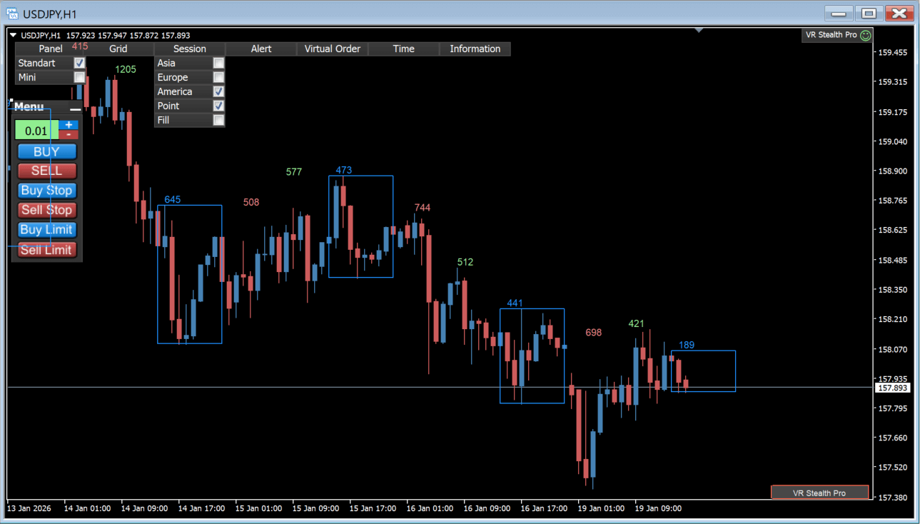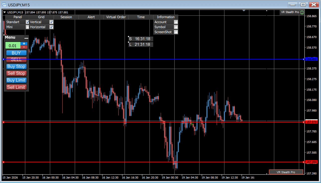 チャート左側に操作パネルを表示し、ロット数を指定してBUY・SELL、Buy StopやSell Limitなどの注文にも対応しており、事前に設定した注文距離をもとに自動で価格が計算されます。