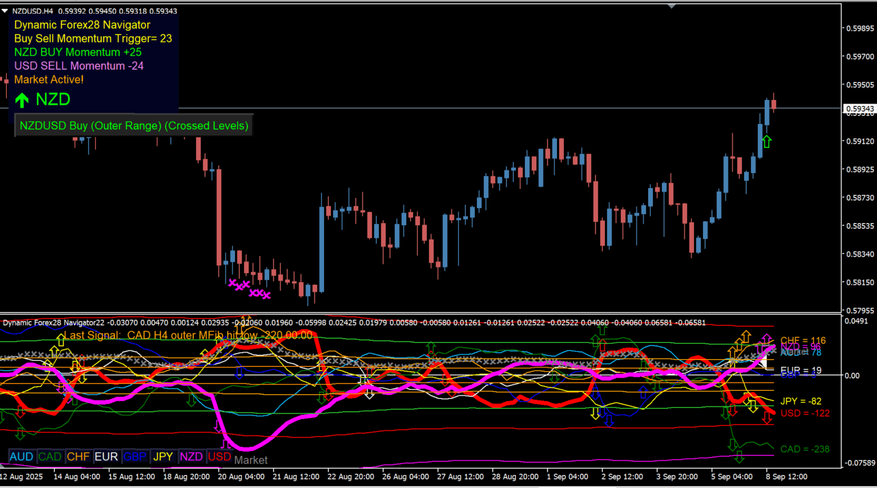 主要28通貨ペアを自動スキャンし、通貨ごとの強弱やモメンタムをチャート上に表示します。特に注目すべきは「モメンタムトリガー」で、一定値(デフォルト23)を超えると強い買い・売りの動きが発生していることを示します。