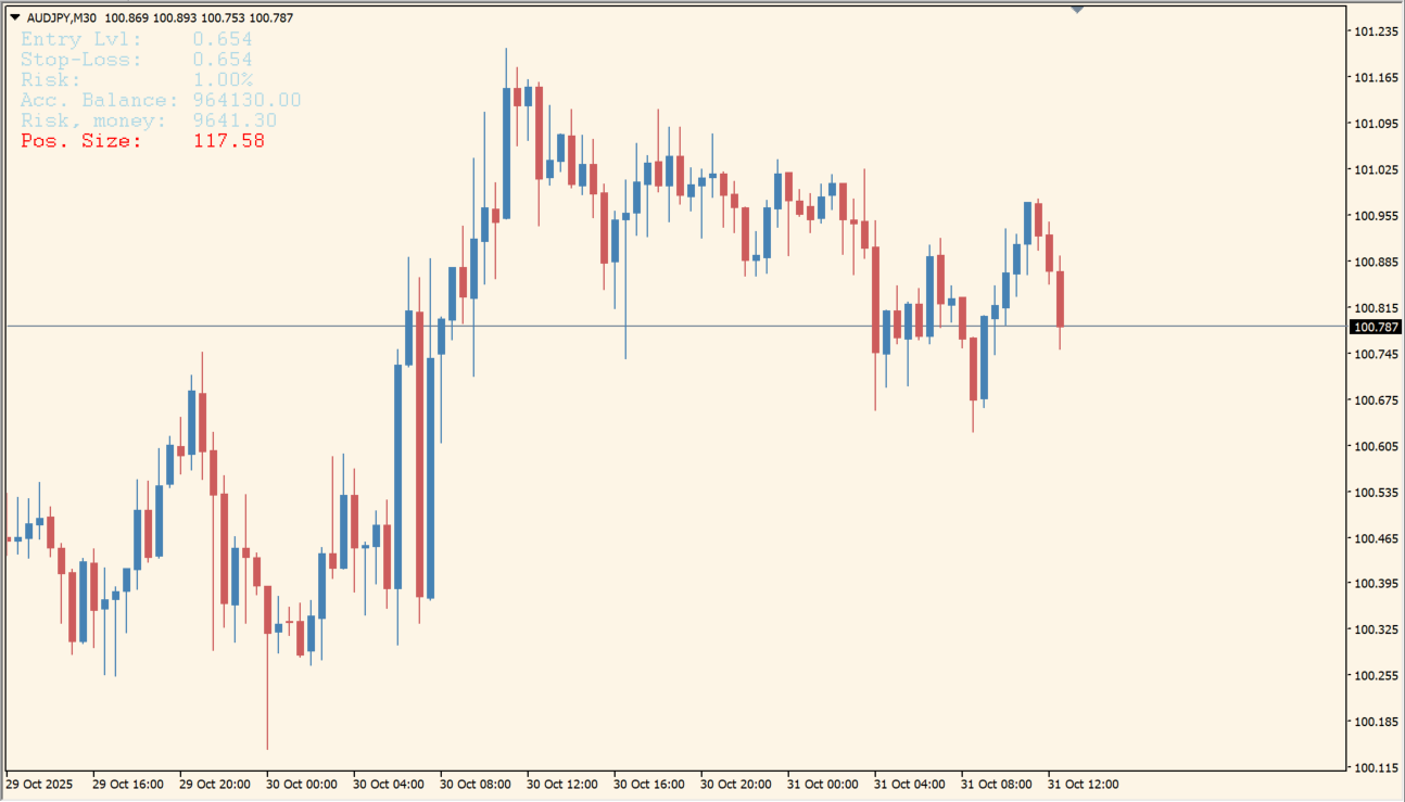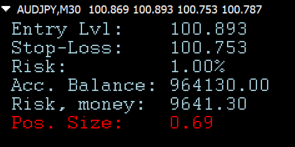 チャート左上に、Entry Level(エントリー価格)、Stop-Loss(損切り価格)、Risk(リスク割合)、Acc. Balance(口座残高)、Risk money(損失金額)、Pos. Size(推奨ロット数)が表示されます。