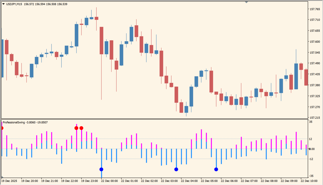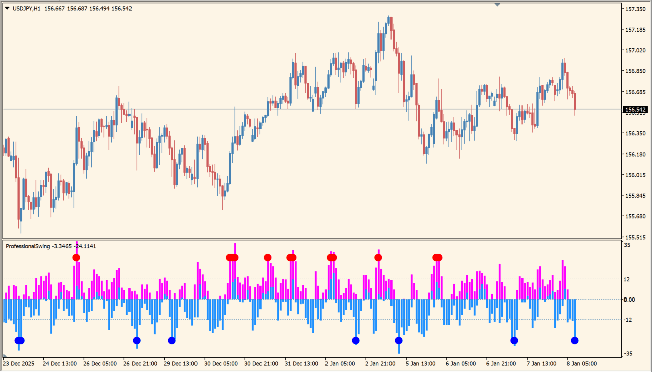 Professional Swing Indicatorは、上下に振れるオシレーターと高値安値ドットを組み合わせ、相場の方向性と転換点を視覚的に示します。