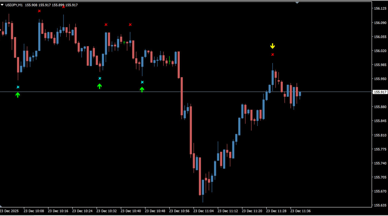 Super Signal v3のロジックは公開されていませんが、相場のパターン変化を検知すると逆張りの矢印を表示しトレンド方向を示します。