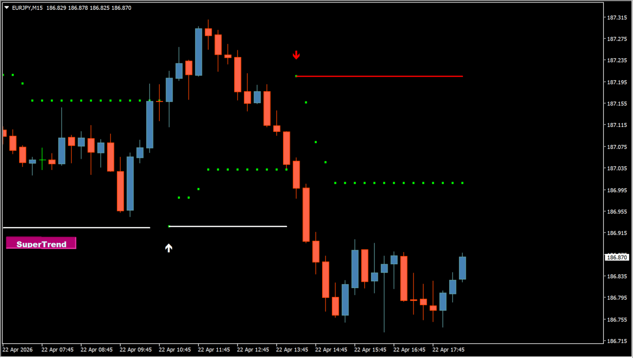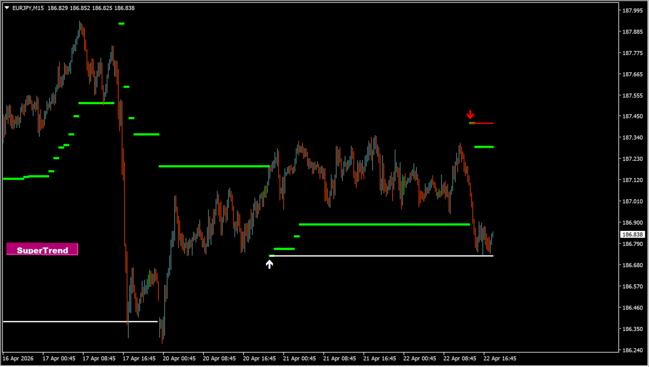 緑のラインは上昇トレンド、反転すると下降トレンドへ切り替わります。価格がラインの上にあれば買い優勢、下なら売り優勢と判断します。赤い矢印は売りシグナル、白い矢印は買いシグナルとして機能し、エントリーの目安になります。