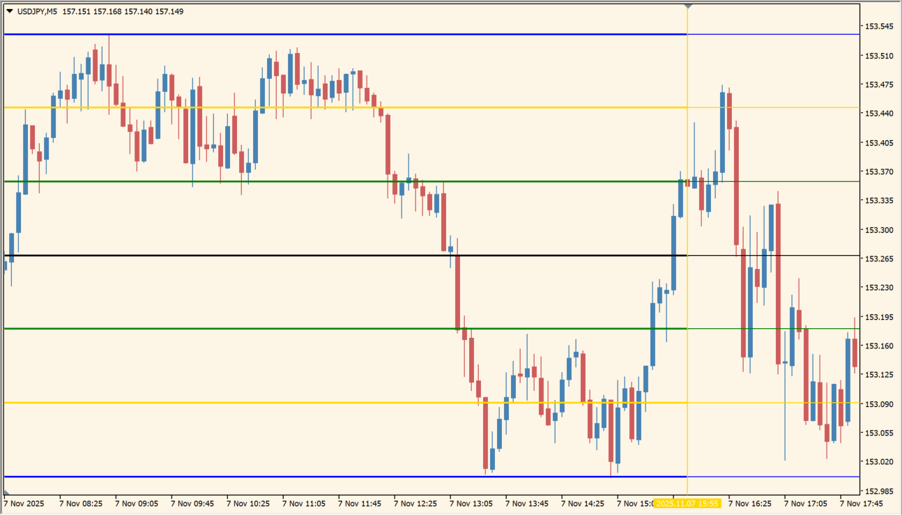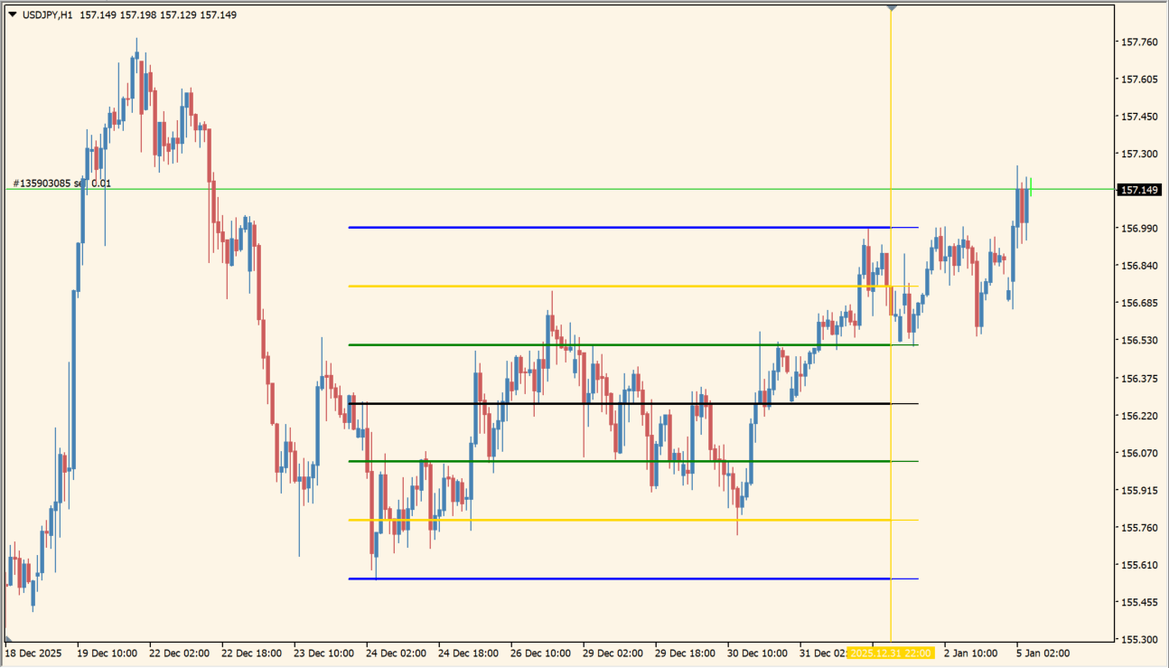 このインジケーターは、価格帯ごとに色分けされた水平ラインでサポート・レジスタンスゾーンを表示します。数値を意識しなくても、色を見るだけで相場の位置関係を判断できます。