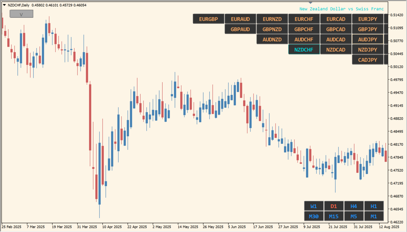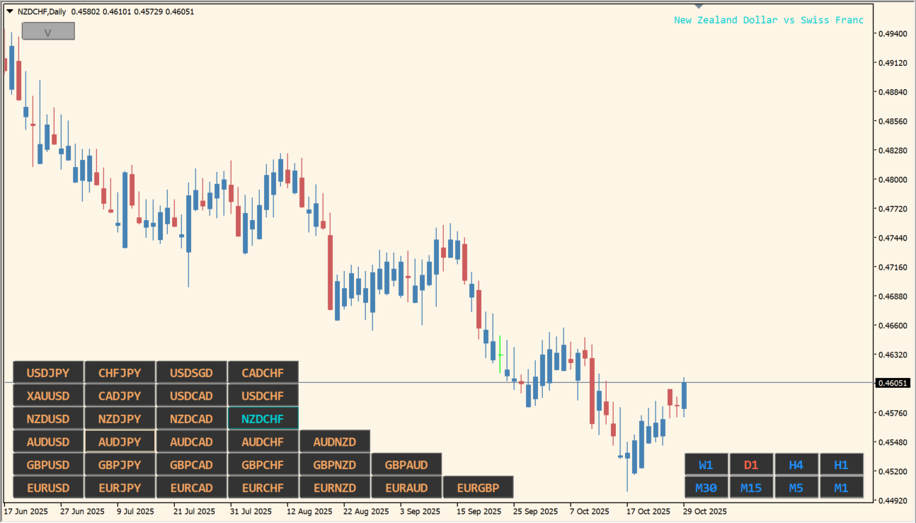 このインジケーターは、チャート上に通貨ペアと時間足を切り替えるボタンを表示し、ワンクリックで瞬時に切替を可能にするツールです。