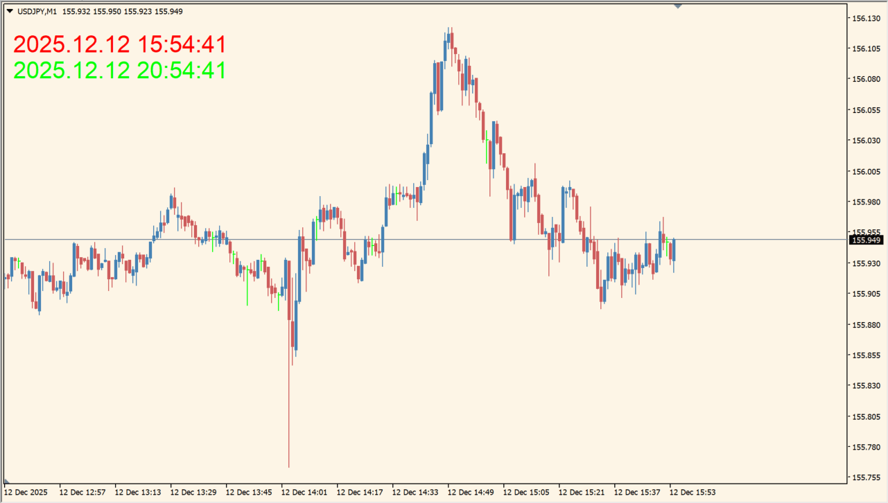 このインジケーターを利用することで、PCの時計をその都度確認したり、ブローカーのサーバー時差を計算したりする必要がなく、視覚的に即座に時間情報を把握できます。