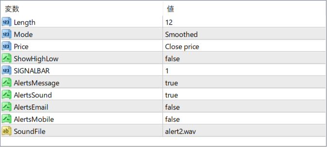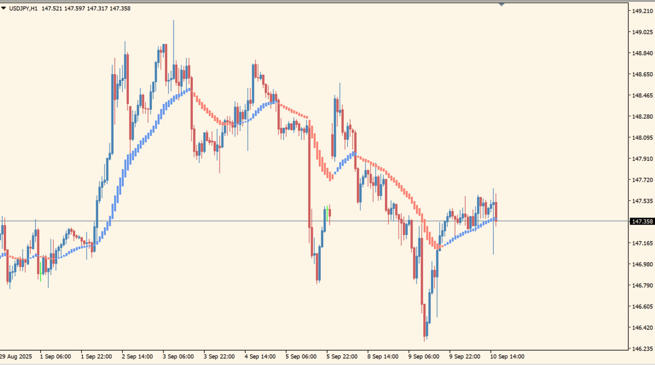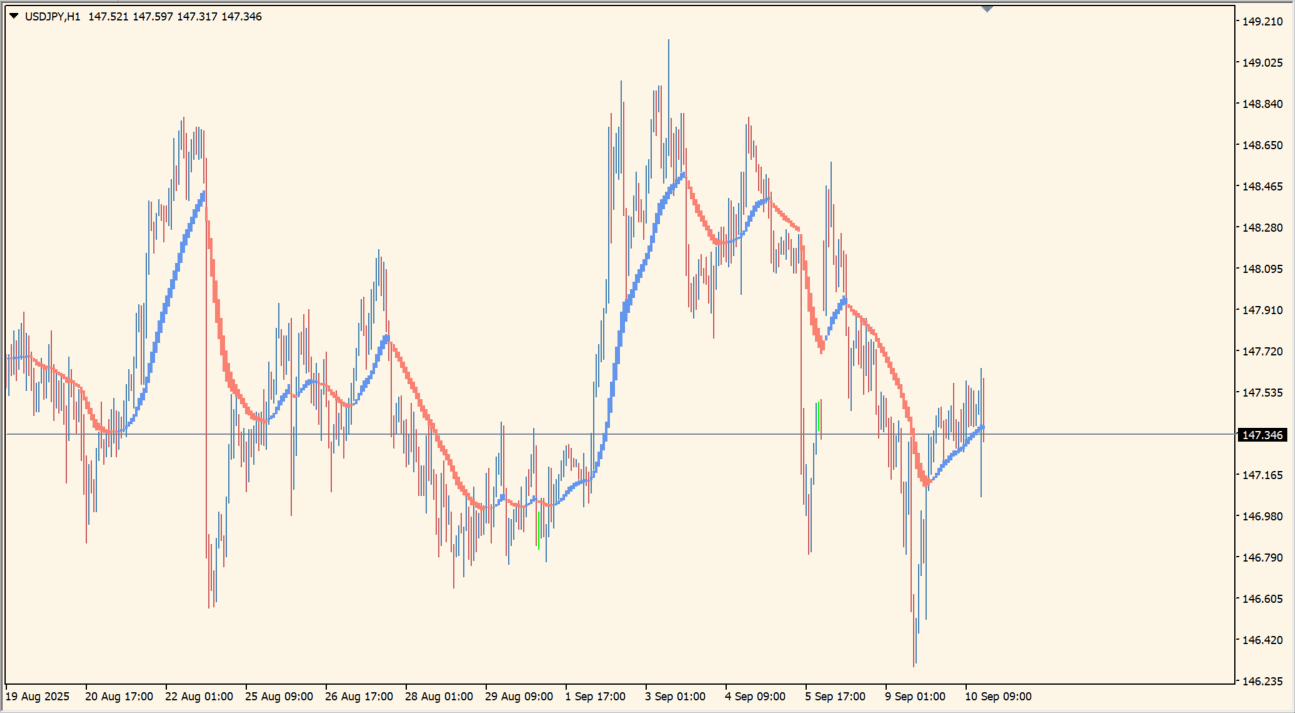 従来の移動平均線に比べ、価格変動に素早く反応し、遅延を軽減している点が特徴です。青のバーが表示されている間は上昇トレンドを示し、赤のバーが表示されると下降トレンドを示します。