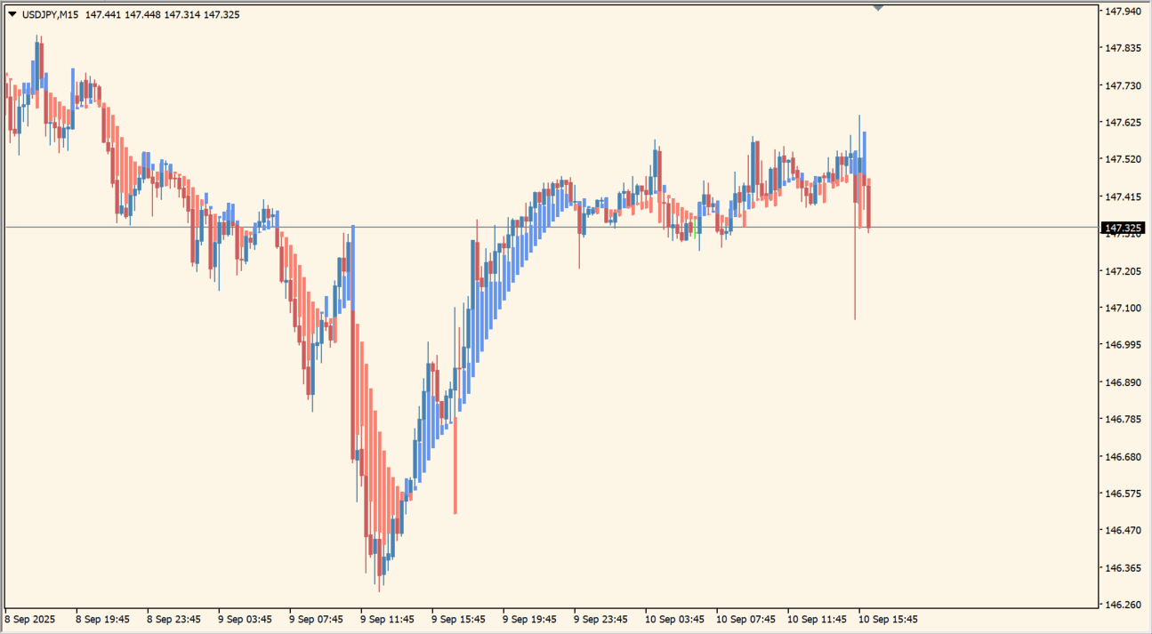 売買の判断はシンプルで、青バーが発生したときに買い、赤バーが出現したときに売りを検討します。特に5分足、15分足、30分足、1時間足といった短期~中期の時間足で効果を発揮し、スキャルピングやデイトレードに活用できます。