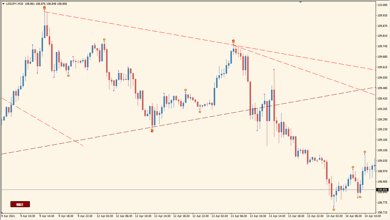 また、波の頂点にはサインが表示されますが、こちらは高値安値が更新されるとそれに合わせて更新されるものですので、実際のトレードでエントリーサインとして使うことはできません。