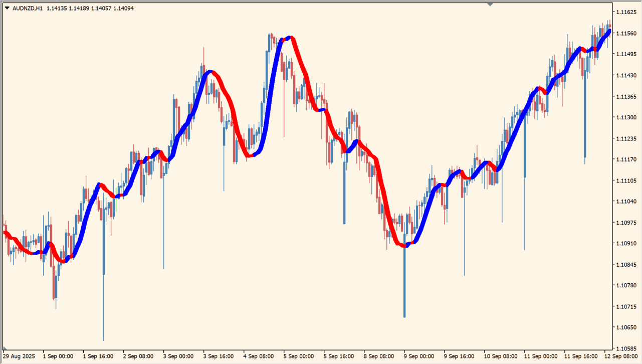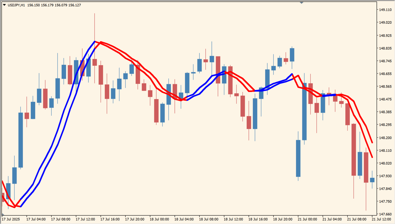 このインジケーターは、価格に追従する2本の動的ラインを用いてトレンド方向を視覚化する仕組みです。上昇相場ではラインが青、下降相場では赤に変わるため、現在のトレンド状態を一目で把握できます。