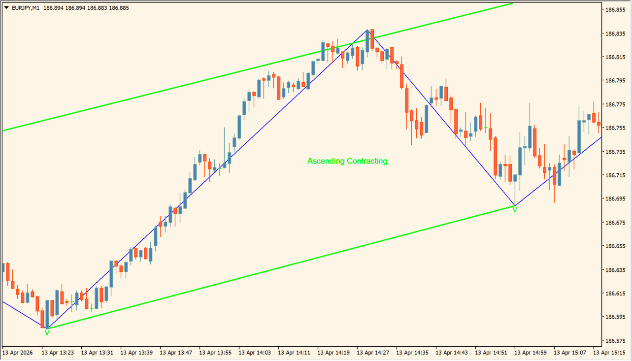 このインジケーターはZigZagの高値・安値をもとに、トライアングルパターンを自動認識し、チャート上にラインとラベルで表示します。上昇型・下降型の収縮三角形を検出でき、相場が収束している局面を視覚的に把握できます。