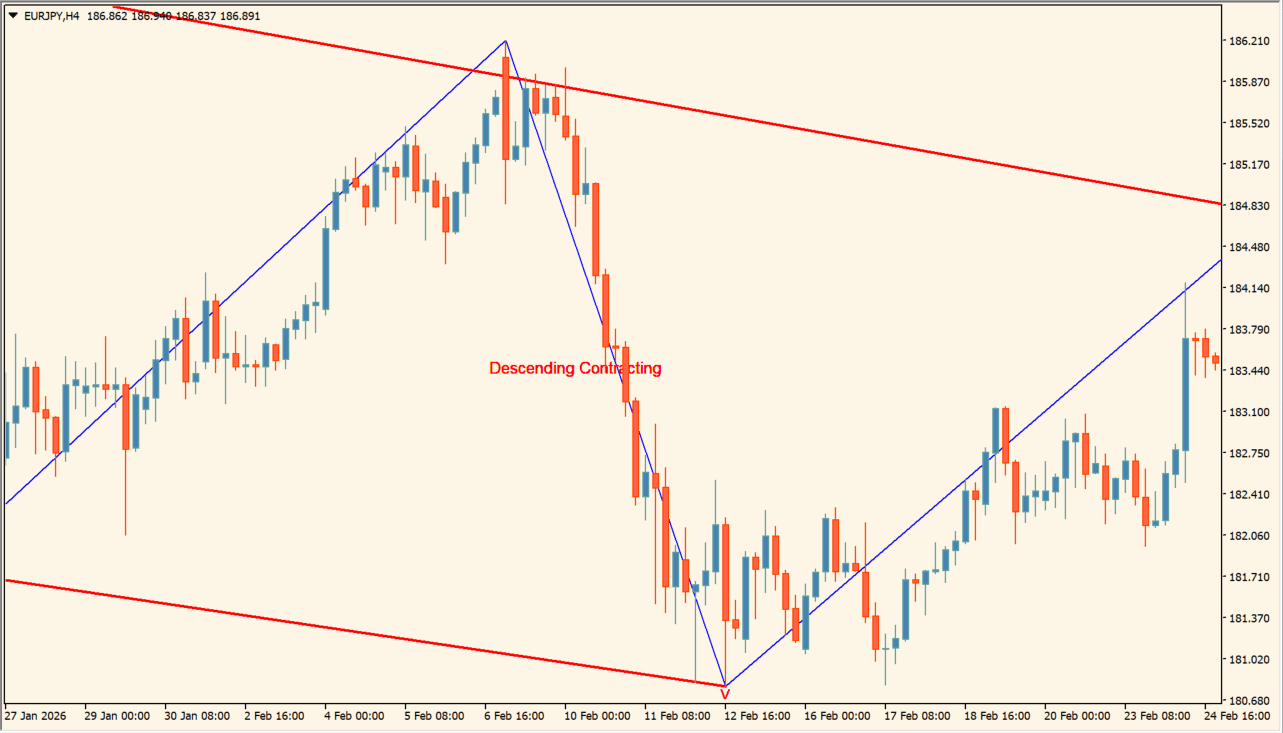 赤色は「Descending Contracting」で、下降トレンドを示唆します