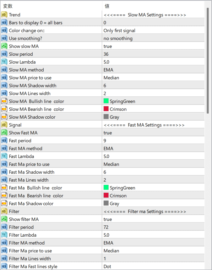 低速EMAの期間を設定し、主なトレンド方向を判断します。